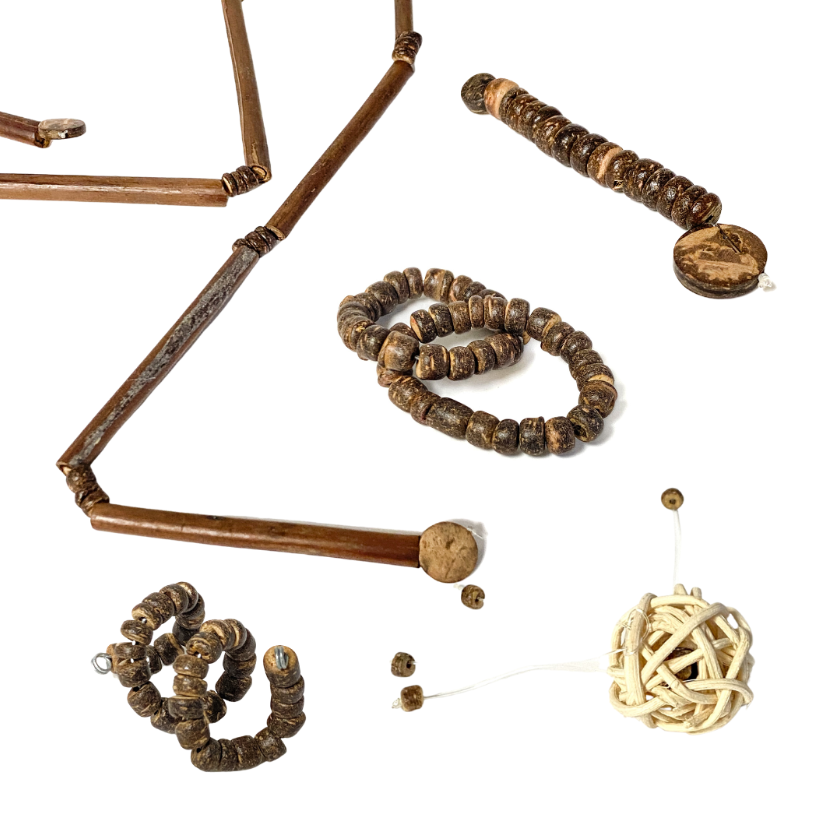 Made with organic coconut shell, the Linked Fur Infinity are two looped circles of coconut shell beads.