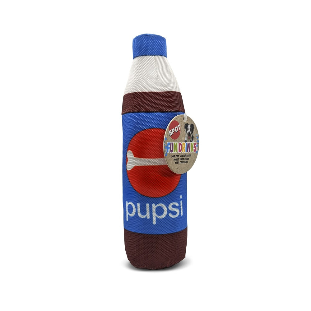 The Pupsi fun drink dog toy. Allows dogs to have a beverage with their chips! Durable poly nylon fabric with crinkle paper and a squeaker.