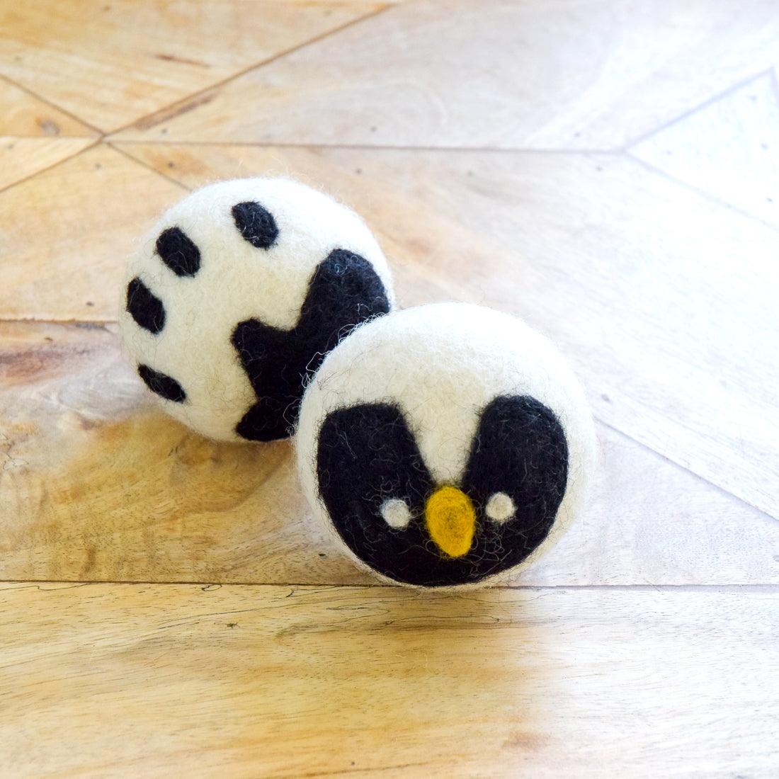 A pair of 2 eco-friendly monochrome (black and white) felt cat ball toys for your pawsome kids. Needle felted with a black paw and an owl design.