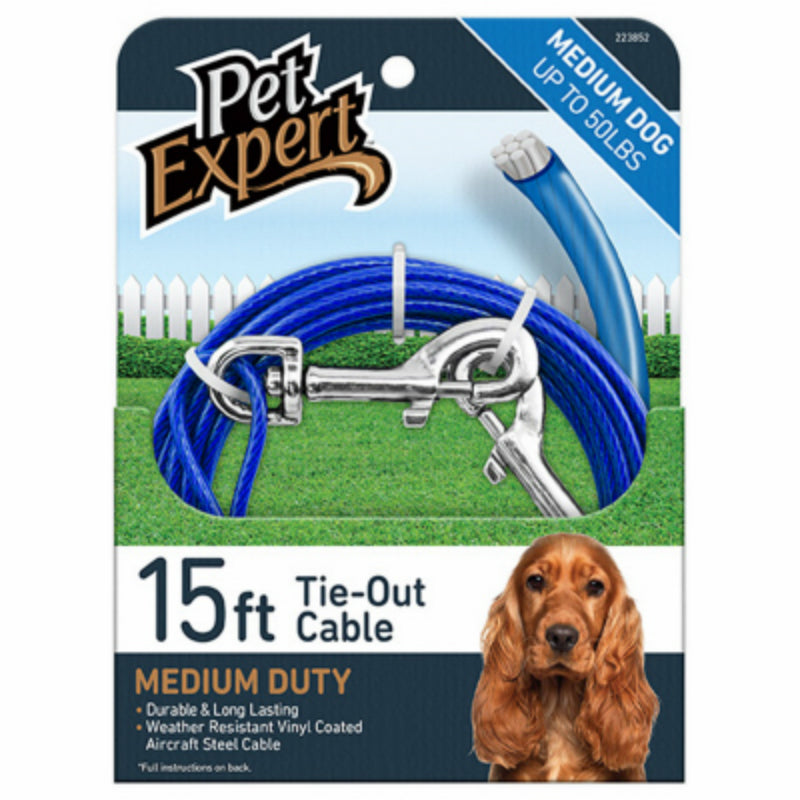 This Pet Expert 15 ft lightweight Dog Tie-Out Cable is a handy way to tie your dog up while still giving it a lot of room to wander. Features forged iron swivel snaps at both ends. Strong and durable, this tie-out clips on easily and is also weather resistant. Crack resistant UV protected vinyl coating.