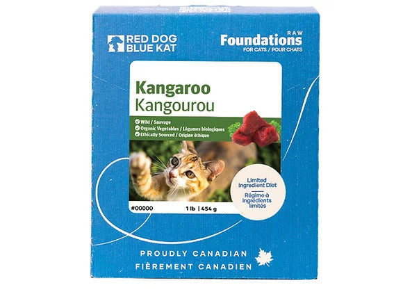Kangaroo and Veggie meals are made from wild Australian kangaroo meat, lamb organs and organic vegetables. The leanest and most exotic of all Red Dog Blue Kat meals, it is great for cats with allergies or food sensitivities and for cats that need to shed a few pounds. Your cat will be hopping around in no time! No additives, preservatives or fillers.