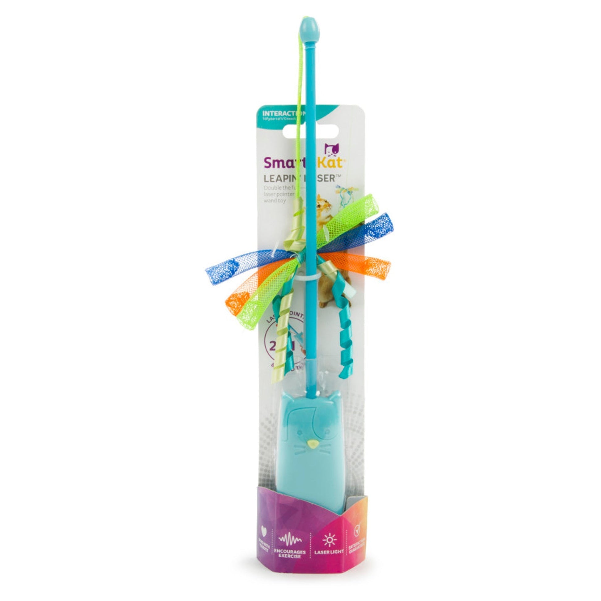 ",You'll be batting a thousand when you swing our Leapin' Laser interactive wand toy in front of your cat. A combination of mesh and ribbons with the added allure of a laser that you control provide a visual and auditory thrill for your cat that will trigger his wildest natural instincts. SmartyKat gives pet parents the best of all worlds: innovative products, stylish designs, environmental responsibility, and exceptional value with a variety of toys to meet a cat?s need for play, scratching, wellness, retreat, rest, and fun! SmartyKat products are designed to meet child safety standards and are backed by our 100% satisfaction guarantee. If a customer is dissatisfied with a SmartyKat product for any reason, we will replace or refund it."